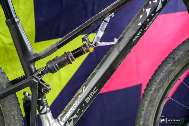 The bike retains BMC’s dual-link suspension platform instead of a flex-stay design and appears to use a modified DT Swiss 29-inch fork adapted to fit the larger wheel size. The front triangle and rear swingarm are crafted from carbon tubes connected by machined aluminum lugs, while a custom stem with a steep negative rise helps fine-tune the fit for the oversized wheels.