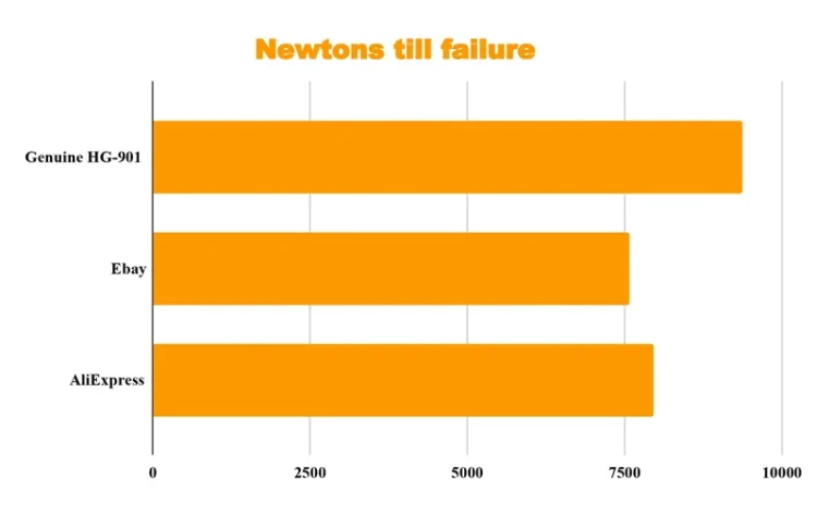 At 5000 N load, the genuine HG-901 showed no measurable deformation. The eBay chain fared worst with 0.38 mm stretch; the AliExpress chain stretched 0.11 mm. More worryingly, both counterfeits began deforming under much lighter loads. And all this after wear testing—with the genuine chain having endured about 3.5 times more test distance.