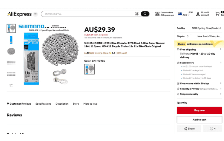 For the test, we didn’t want to buy obvious US$10 fakes from secondhand platforms. Instead, we sought out chains that could be mistaken for genuine. One fake was purchased via eBay for AU$62.69 (~¥300 RMB); another came from AliExpress for AU$29.39 (~¥144 RMB) from a seller claiming authenticity—even showing a Shimano anti-counterfeit label in photos. We considered ordering from Amazon, but import delays and near-double pricing made it impractical.