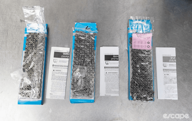 Inside, more differences emerged. The sealed plastic wrapping varied, but most notably, the genuine Shimano chain had its quick-link packaged separately, while both counterfeits included it loose in the bag.