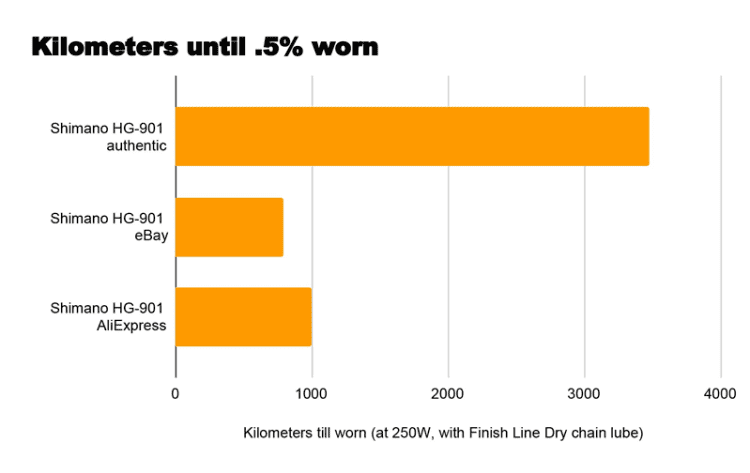The results clearly show that buying counterfeit chains is a false economy. Although sample sizes were small, the genuine HG-901 lasted at least three times longer than the fakes. Importantly, chain wear directly causes wear on chainrings and cassettes, multiplying the cost far beyond the chain itself.