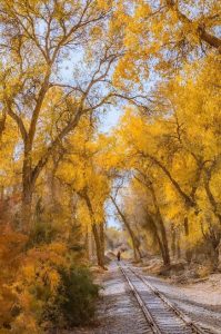 This route stretches from Qiemo to Luonannan County, crossing a vast desert landscape dotted with the golden splendour of Luntai’s Euphrates poplar forests. Cycling this 500-kilometer desert highway is a challenge many riders aspire to conquer. Along the way, you’ll witness scenes reminiscent of classic Tang dynasty poetry—“a lone smoke plume rising into the sky over the vast desert, and the grand river under the setting sun.” In autumn, the poplar forests are at their most beautiful. Visitors can take a scenic train ride through the poplar groves and feel as though they’ve stepped into a golden fairy-tale world.