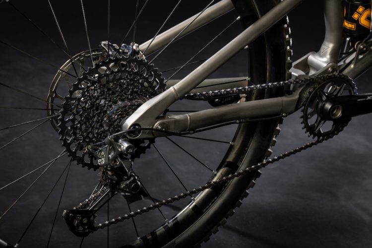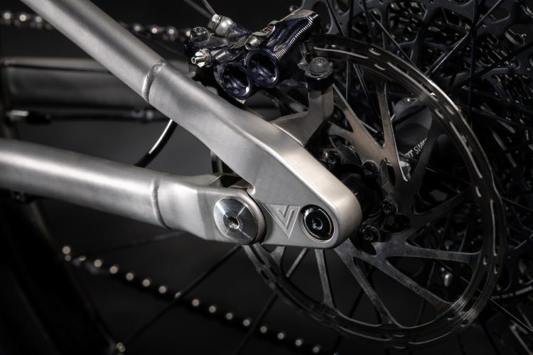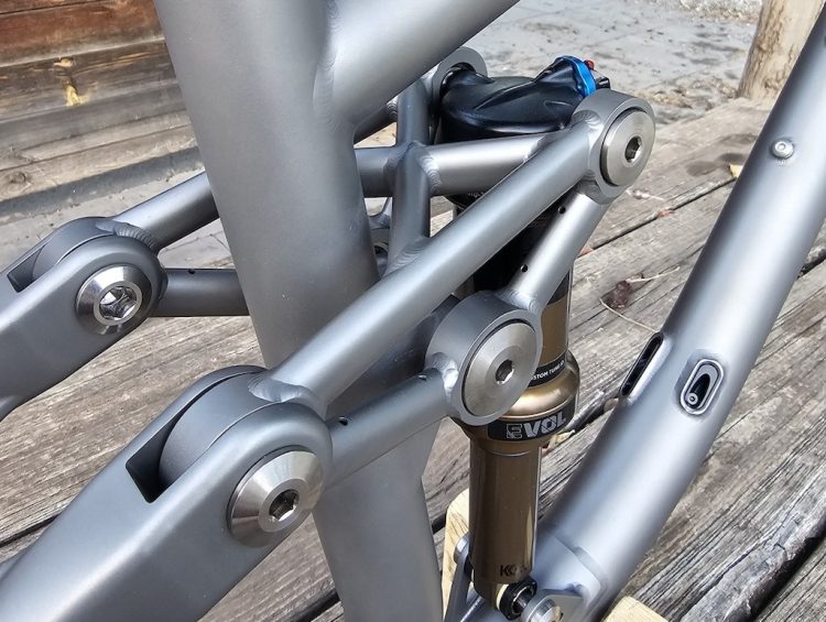 Constructed from 3AL-2.5V titanium tubing with 3D-printed titanium parts in key areas like the rear triangle, the frame achieves both precision and strength. Pivot points and bearing interfaces are optimized for stiffness, especially around the bottom bracket and rear triangle. All axles and hardware are also custom-machined from titanium, underscoring the bike’s premium build.